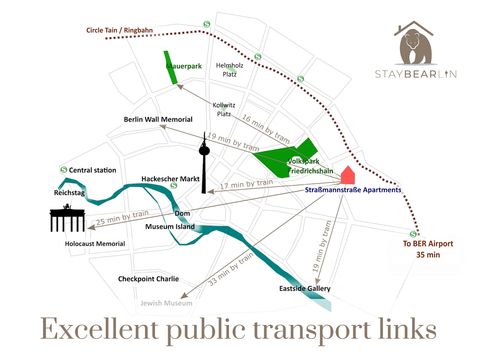 Lovingly renovated 2-bedroom apartment in vibrant Friedrichshain, Berlin — a perfect haven for families, small groups of friends, or anyone seeking a peaceful city escape. Located in a residential building, it’s suited for quiet guests only. No parties or loud behavior allowed, ensuring a peaceful stay for you and our neighbors. Ideally located just steps from a tram stop, this well-equipped retreat offers comfort and convenience, making it your ideal base for exploring Berlin. Step into a this modern ground-floor apartment, thoughtfully converted from a former office space (legally approved by the city of Berlin, so you can stay guilt-free without impacting local housing). With two separate bedrooms, it’s perfect for those who value privacy and comfort: * Master Bedroom: Features a cozy 160x200 bed with single duvets and ample wardrobe space, overlooking a tranquil courtyard. * Second Bedroom: Offers another 160x200 boxspring bed with single duvets, a comfy couch, and a dresser—also courtyard-facing for a restful sleep. The fully equipped kitchen has everything you need to whip up a simple meal or enjoy a leisurely breakfast: a hob, microwave, coffee maker, toaster, kettle, and a table with four chairs. We’ve stocked it with essentials like tea, coffee, and salt to get you started. Note: There’s no range hood, so light cooking is recommended to avoid setting off the fire alarm. The compact bathroom includes a shower, small sink, toilet, and a hairdryer for your convenience. While there’s no TV, bring your laptop to unwind with your favorite shows after a day of sightseeing. Free Wifi is provided. For Families Traveling with little ones? We’ve got you covered! We can provide a cot (for a small surcharge), plus a high chair, kids’ plates, cutlery, and a selection of toys and books to keep them entertained. The Vibe This apartment is all about calm and comfort—located in a residential building, it’s suited for quiet guests only. No parties or loud behavior allowed, ensuring a peaceful stay for you and our neighbors. It’s the perfect spot to recharge after exploring Berlin’s bustling streets. Prime Location Nestled in a quiet neighborhood, you’re just a stone’s throw from a tram stop, with S-Bahn and U-Bahn stations nearby for quick trips across the city. Stroll to Volkspark Friedrichshain, savor a pastry from the delicious bakery opposite, or grab a slice at the cozy pizza place across the street. Supermarkets, cafes, and restaurants are all within easy reach, and Alexanderplatz is just a 40-minute walk or a short tram ride away. Why Guests Love It “Spacious, clean, and quiet—a perfect base for our family!” “The location is unbeatable—tram right around the corner and so many great spots nearby.” “Alan and Kasia are amazing hosts—responsive and full of helpful tips!” Good to Know Check-in is a breeze, and we’re always here to assist. The apartment is on the ground floor facing the courtyard, keeping it quiet despite its central location. Free parking is often available nearby, but it’s street parking—first come, first served. As our guest you will have the whole apartment to yourself. You won’t have to share it with anybody else. Once you have booked you will receive a welcome email from us with information about the check in procedure and extensive recommendations for activities, sightseeing, restaurants and bars in Berlin. During your stay we will also be there for you by email or phone. The apartment is located on Straßmannstraße in the Friedrichshain district. On the same street as the apartment you will find a couple of local cafes, bars and restaurants. A little bakery is right opposite of the apartment where you can get fresh buns for your breakfast. 200 meters down the street is “Pomodorino”, one of Berlin’s best pizza joints. It's tasty, quick, authentic and cheap. Right opposite of Pomodorino is a playground, so on a sunny day you can grab a slice to go and enjoy the sun while watching your children play. 10 minutes’ walk down the main street is “Volkspark Friedrichshain”. This large and popular park, with a fairytale fountain, film showings and beer gardens, is a nice place for hanging out in the summer. For those who prefer a more active holiday it offers facilities for jogging, beach volleyball, bouldering and tennis! Only 100 meters away from the apartment is the tram stop “Straßmannstraße”. The "M10" tram line will quickly take you to the East Side Gallery, the longest still intact piece of the Berlin Wall that has been painted by graffiti artists, and the neighbouring buzzing nightlife areas Simon-Dach-Straße and Revaler Straße with the quirky RAW Gelände. From the East Side Gallery it is only a short walk across the river and you are in the popular Kreuzberg district, which is a great place to look out for street art, hang out in the Görlitzer Park (which locals call Görli), or go out drinking or clubbing. Taking the M10 in the other direction will take you to the Prenzlauer Berg district with its many restaurants, cafes, boutique shops and its famous Mauerpark flea market with outdoor karaoke and the Berlin wall walk and Berlin wall memorial. Excellent public transportation connections take you into the Mitte district in about 20 minutes, where you can visit main Berlin attractions such as the Museum Island, the Berlin Cathedral (Berliner Dom) or Hackescher Markt. From there you can walk to the Brandenburg Gate, the Holocaust Memorial and Checkpoint Charlie. The M10 tram stops only a couple of meters away from the apartment. The name of the closest stop is "Straßmannstraße". BABY COT Available for surcharge. Subject to availability INTERNET Available via wifi. The router is in the apartment next door. LINEN & TOWELS Bed linen and 1 hand towel + 1 bath towel per person are included. Extra towels cost extra and need to be ordered prior to your arrival. PARKING Free public parking is available 
