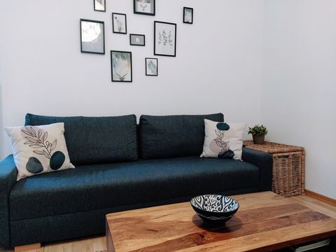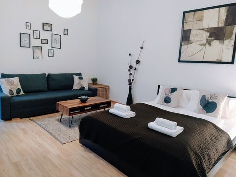 The main living area has a comfortable queen size bed (160x200), a stylish couch that can be converted into a double bed (184x196), a dinner table with chairs and a spacious wardrobe.